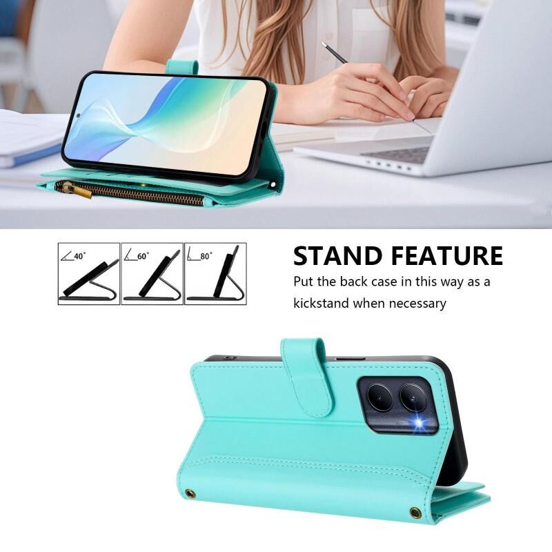 For Realme C33 2022 Global / C33 2023 Global Magnetic Closure 9 Card Slots Zipper Leather Case with Hand Strap(Mint Green)