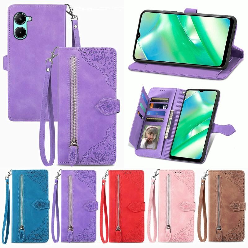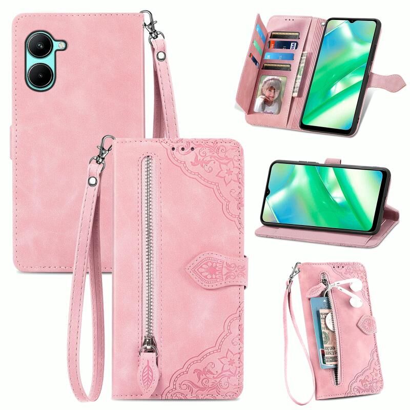 Για Realme C33 ανάγλυφο λουλούδι φερμουάρ δερμάτινη θήκη τηλεφώνου (Rose Gold)