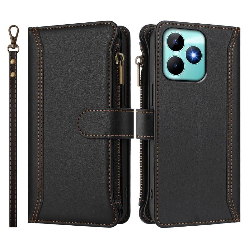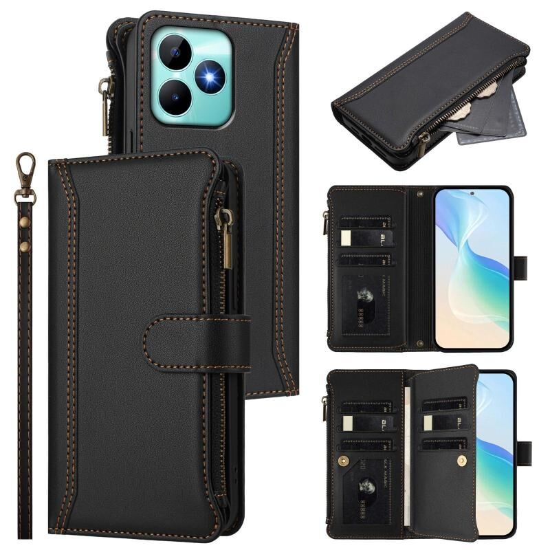 For Realme C53 4G Global / C51 4G Magnetic Closure 9 Card Slots Zipper Leather Case with Hand Strap(Black)