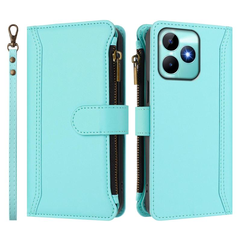 For Realme C53 4G Global / C51 4G Magnetic Closure 9 Card Slots Zipper Leather Case with Hand Strap(Mint Green)