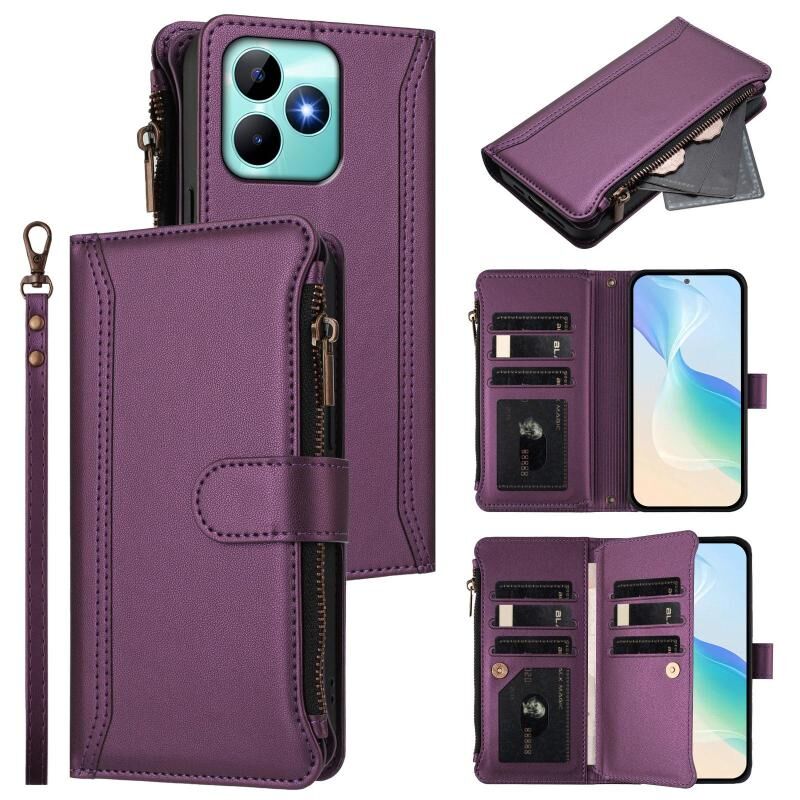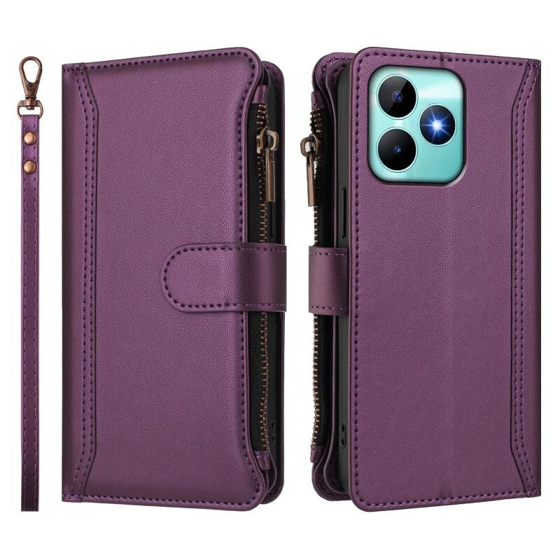 For Realme C53 4G Global / C51 4G Magnetic Closure 9 Card Slots Zipper Leather Case with Hand Strap(Purple)