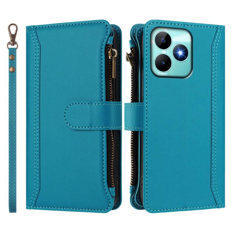 For Realme C53 4G Global / C51 4G Magnetic Closure 9 Card Slots Zipper Leather Case with Hand Strap(Turquoise)