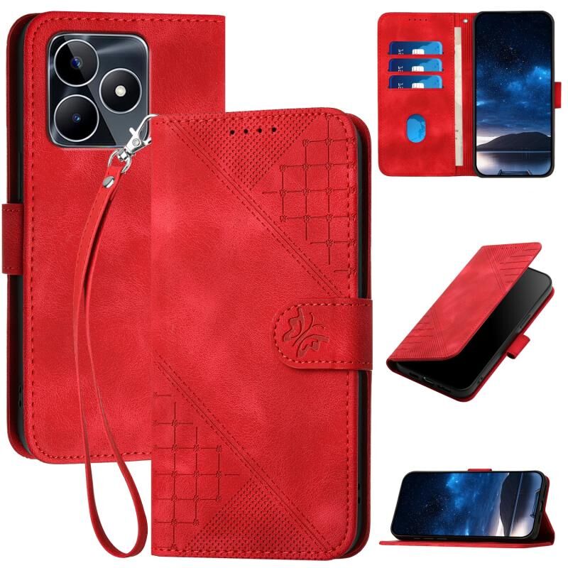 For Realme C53 / Narzo N53 Grid Butterfly Embossed Pattern Leather Phone Case with Lanyard(Red)