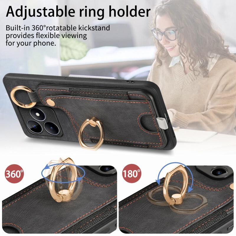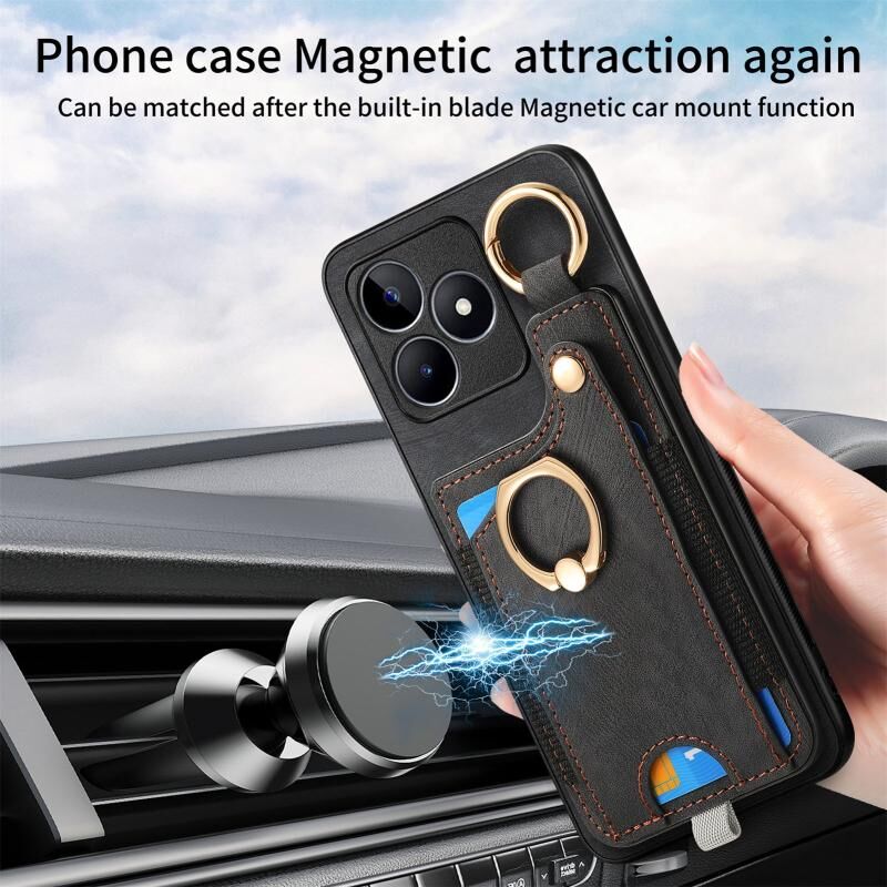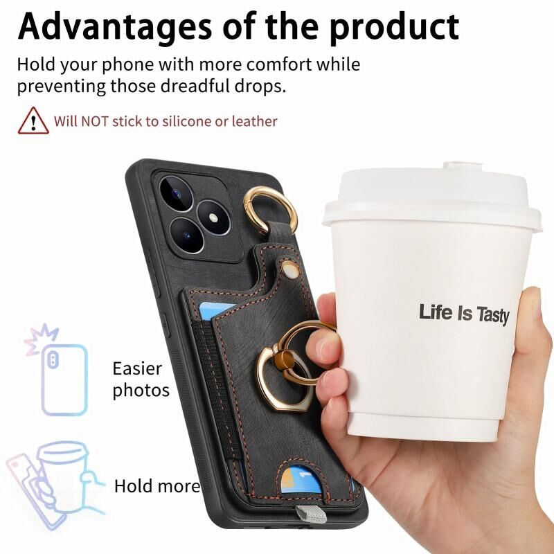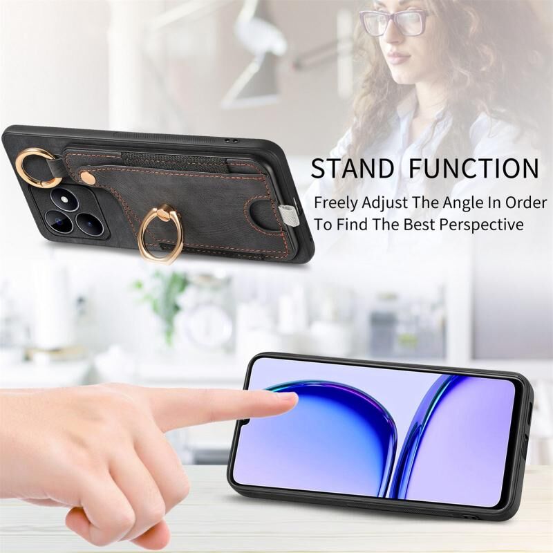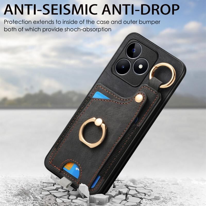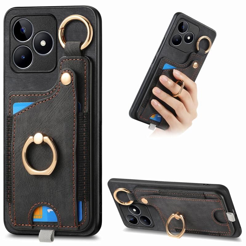 Για Realme C53 Ρετρό δέρμα αίσθηση δαχτυλίδι τσάντα κάρτα υπόθεση τηλεφώνου με Hang Loop (Μαύρο)