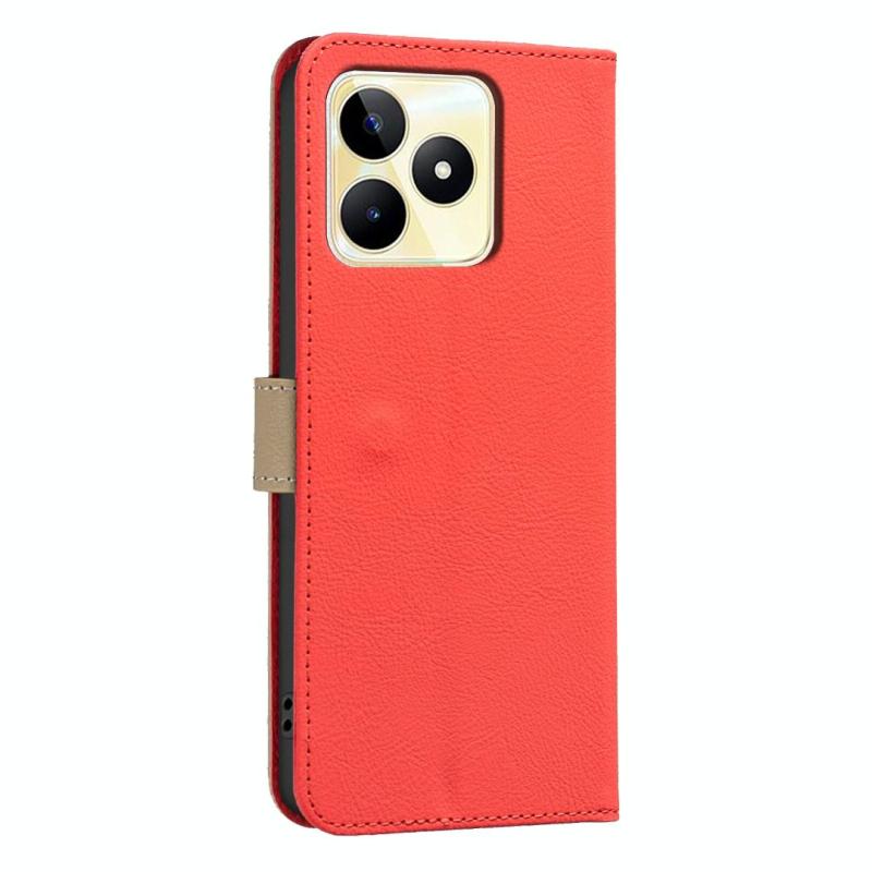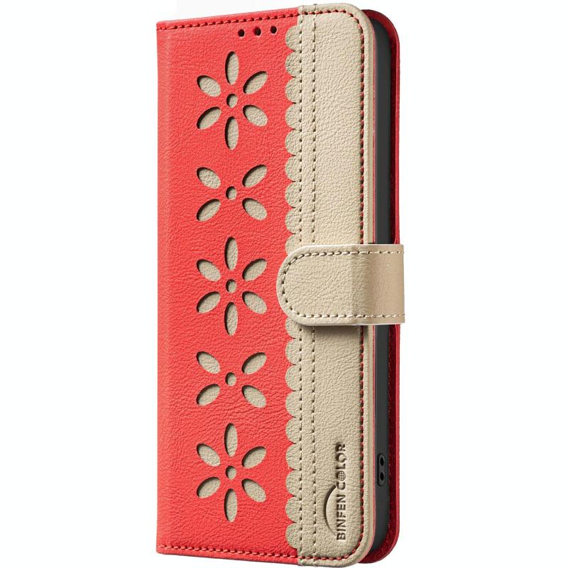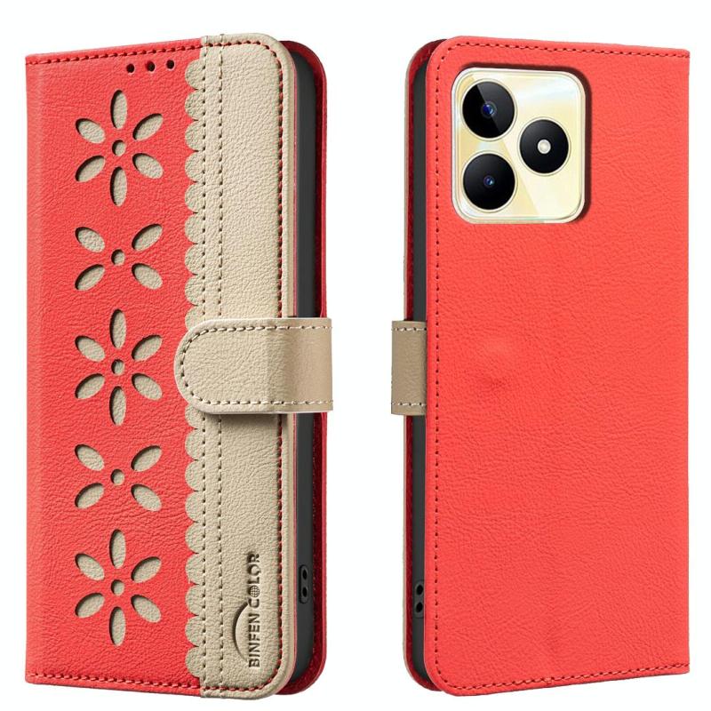 For Realme C53 Splicing Color Hollow Flower Pattern RFID Leather Phone Case(Red)