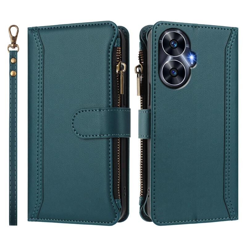 For Realme C55 4G Global / Narzo N55 Magnetic Closure 9 Card Slots Zipper Leather Case with Hand Strap(Dark Green)
