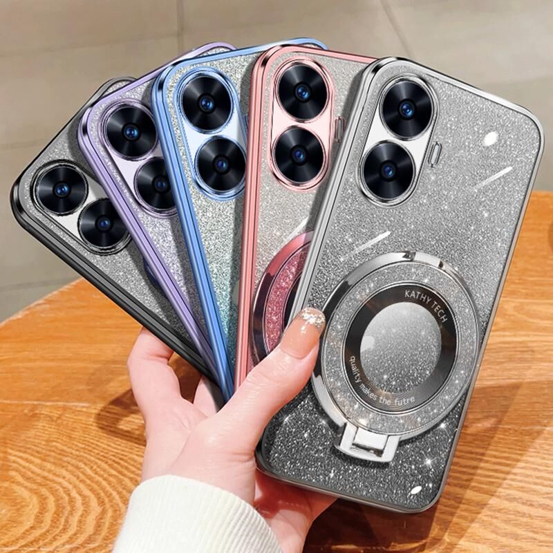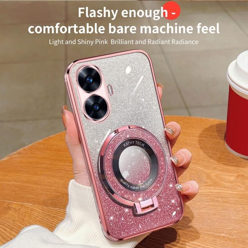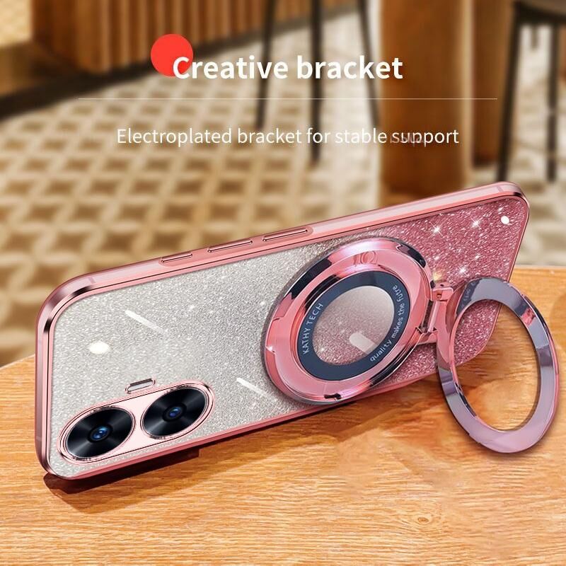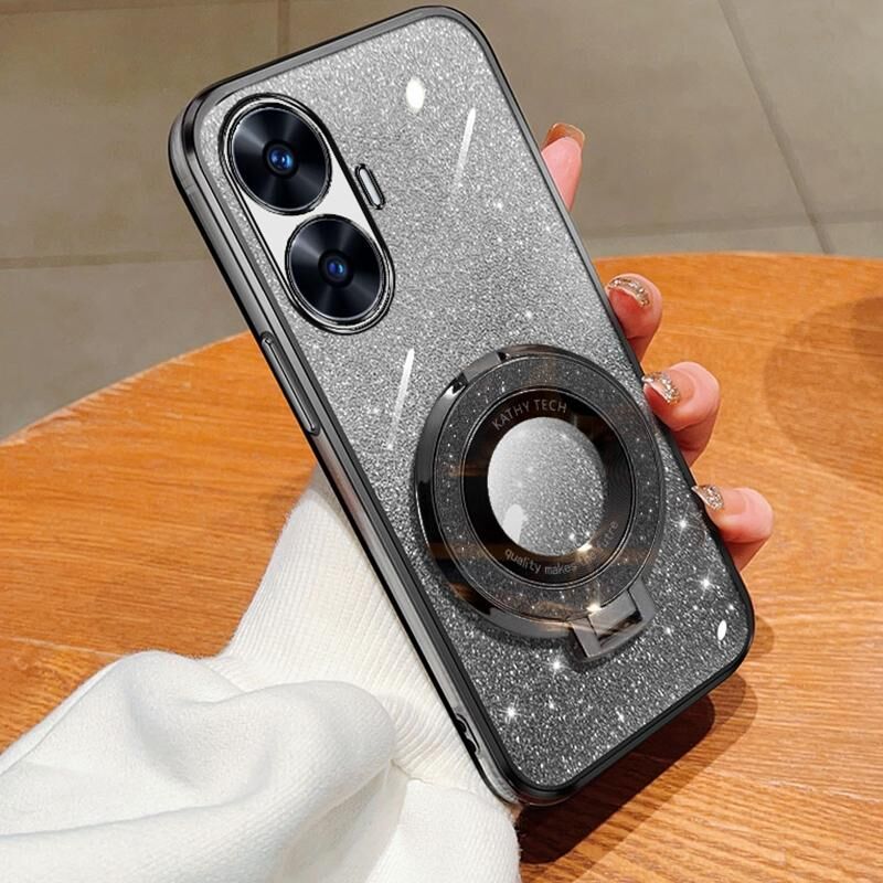For Realme C55 4G Plated Gradient Glitter Round Holder TPU Phone Case(Black)