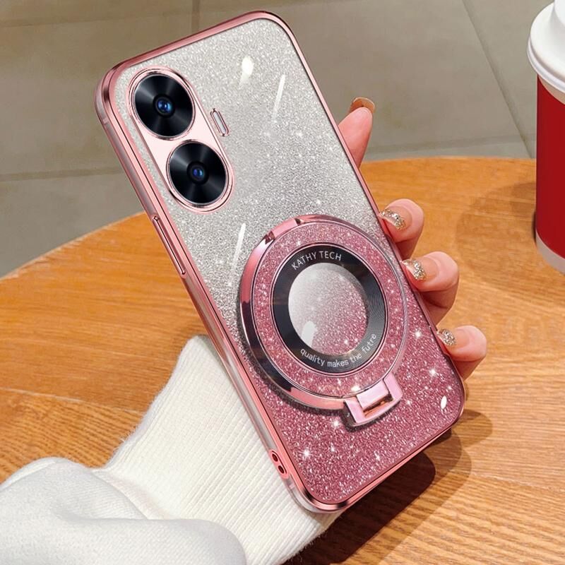 For Realme C55 4G Plated Gradient Glitter Round Holder TPU Phone Case(Pink)