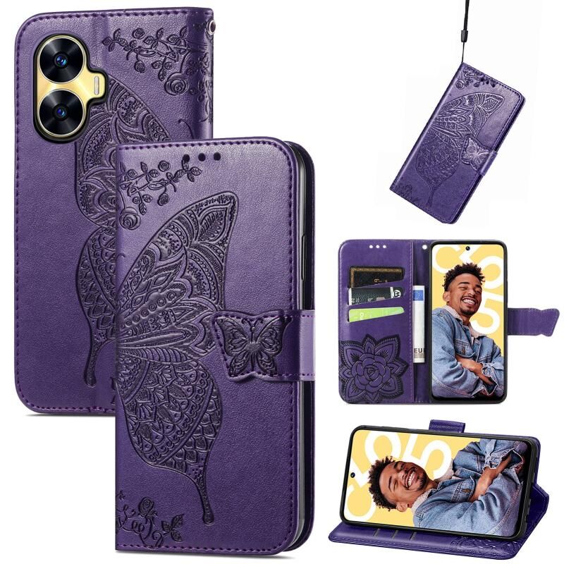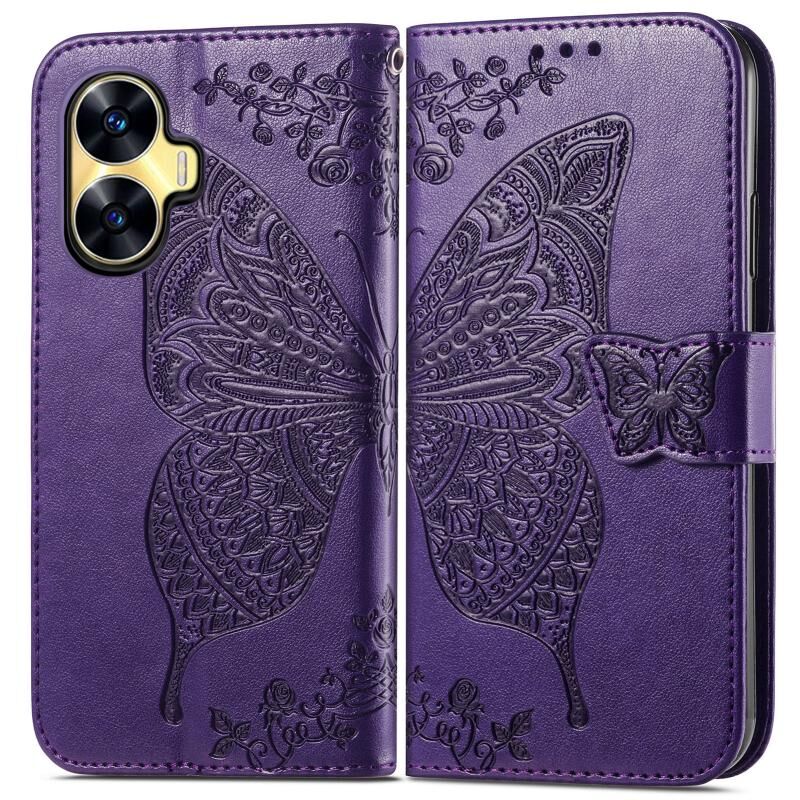 Θήκη τηλεφώνου από δέρμα με ανάγλυφο σχέδιο πεταλούδας και λουλουδιών για Realme C55 (Χρυσό Ροζ)