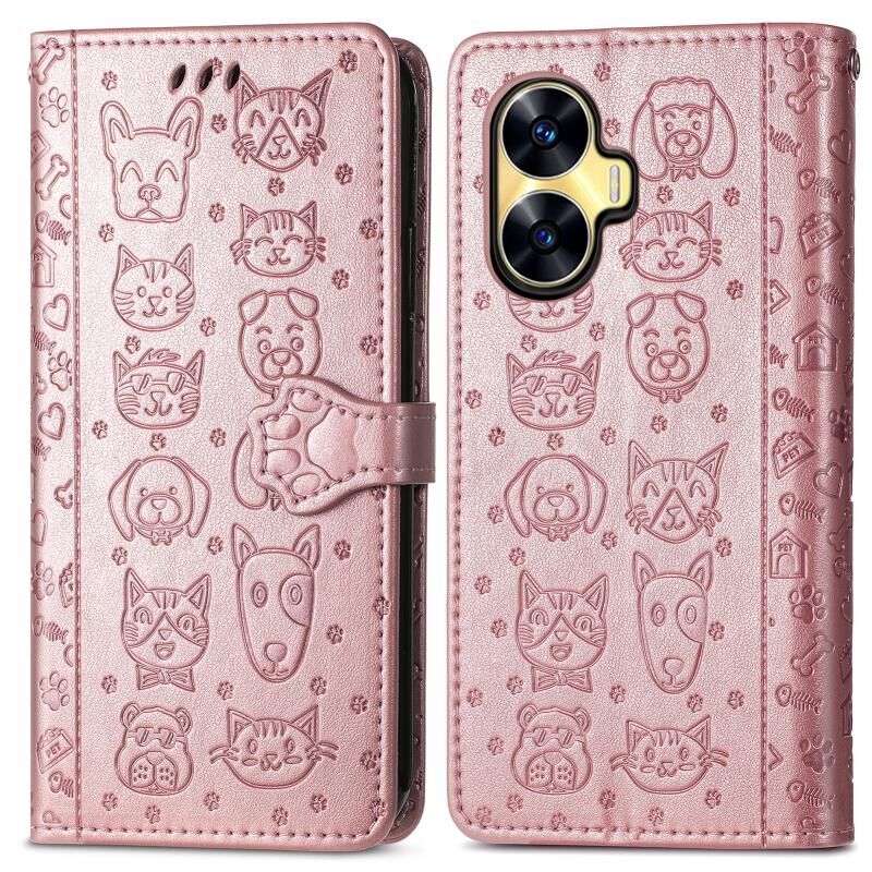 For Realme C55 Cat and Dog Embossed Phone Leather Phone Case(Rose Gold)