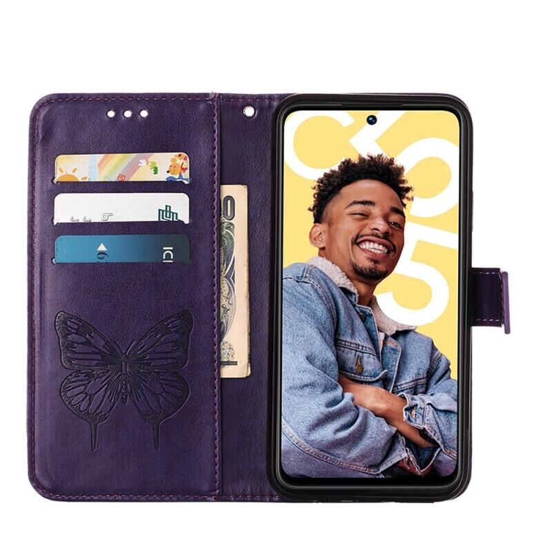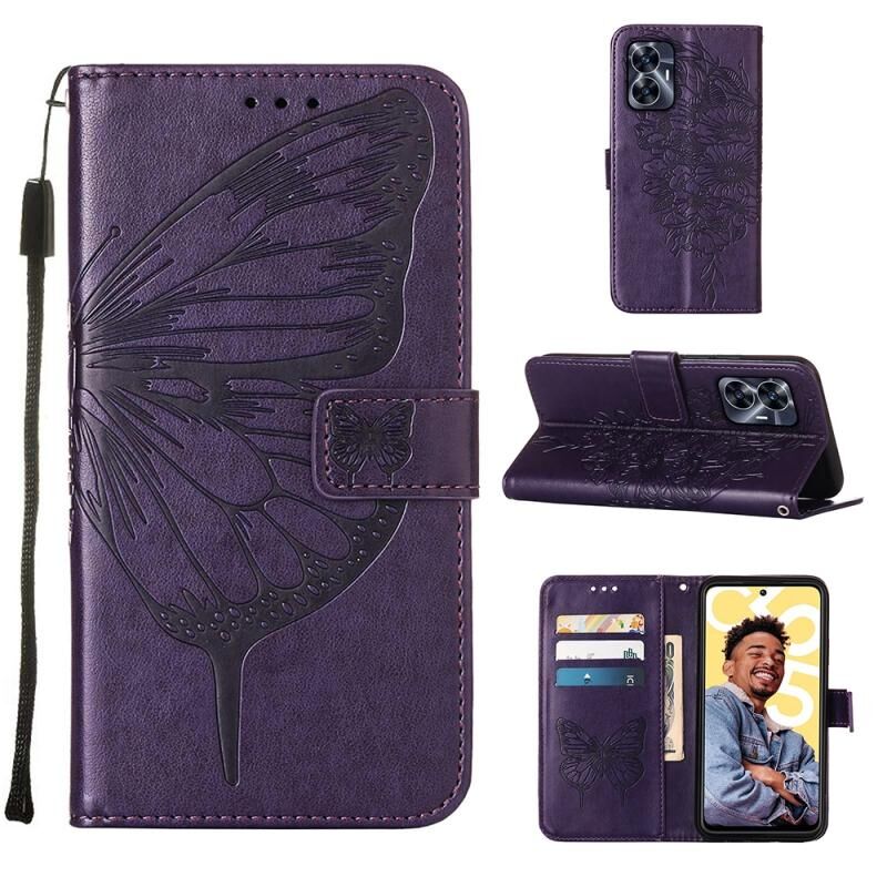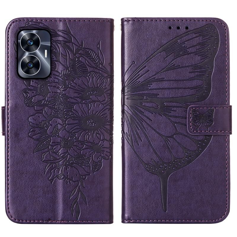 Θήκη τηλεφώνου από δέρμα με ανάγλυφο σχέδιο πεταλούδας για Realme C55 (Σκούρο Μωβ)