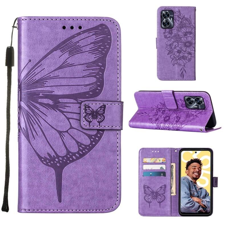 Θήκη τηλεφώνου από δέρμα με ανάγλυφο σχέδιο πεταλούδας για Realme C55 (Σκούρο Μωβ)