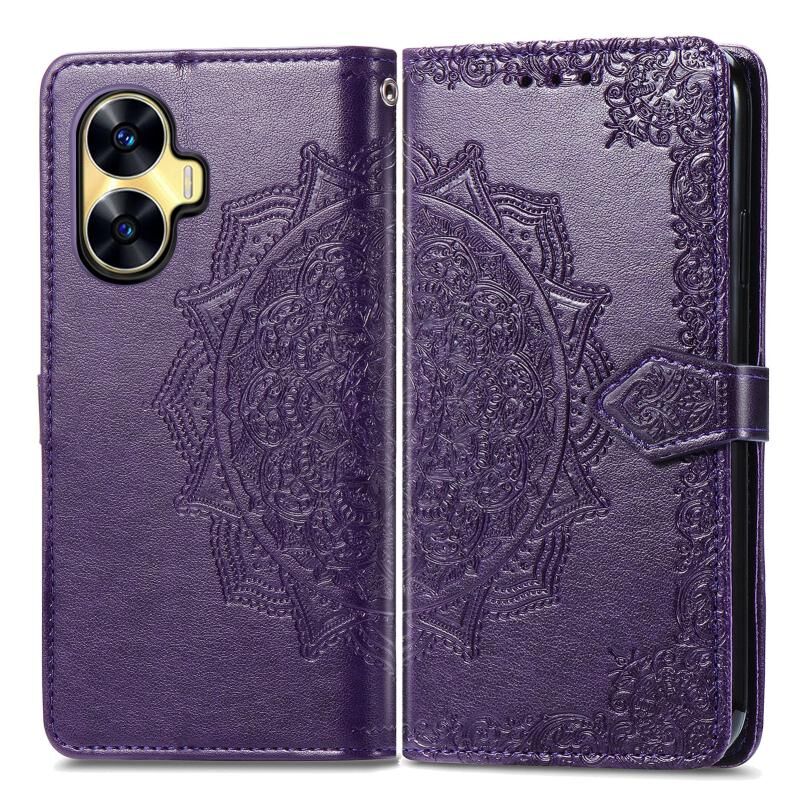 Για Realme C55 Mandala λουλούδι ανάγλυφο δερμάτινη θήκη τηλεφώνου (μωβ)