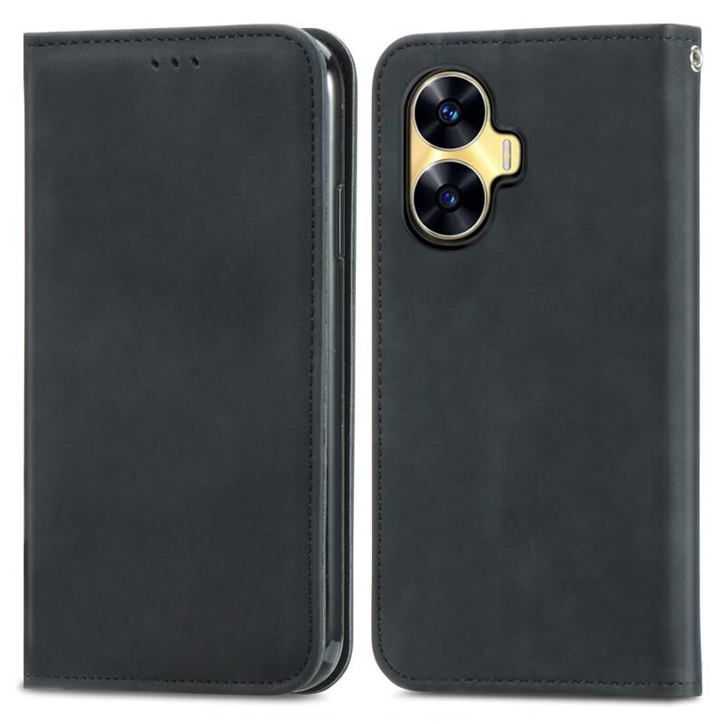 Για Realme C55 Ρετρό δέρμα αίσθηση μαγνητικό δέρμα τηλέφωνο υπόθεση (Μαύρο)