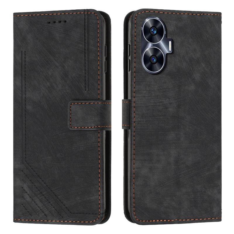 For Realme C55 Skin Feel Stripe Pattern Leather Phone Case with Lanyard(Black)