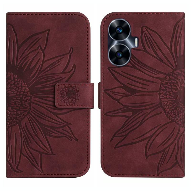 Θήκη τηλεφώνου Realme C55 με δερμάτινη υφή, ανάγλυφο σχέδιο ηλίανθου και λουρί (Κίτρινο)