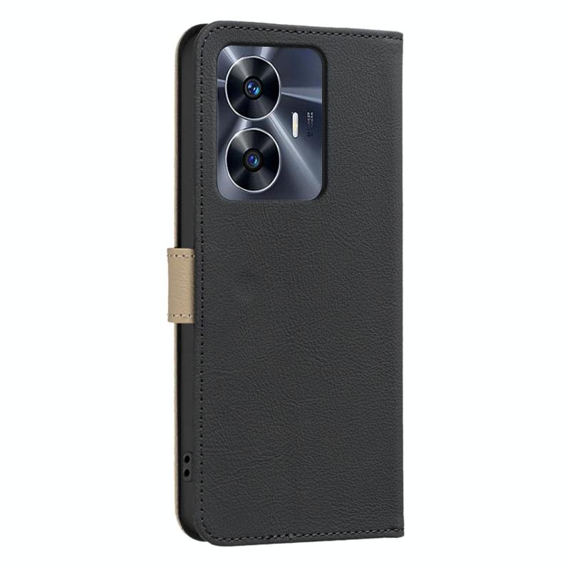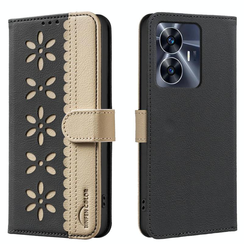 For Realme C55 Splicing Color Hollow Flower Pattern RFID Leather Phone Case(Black)