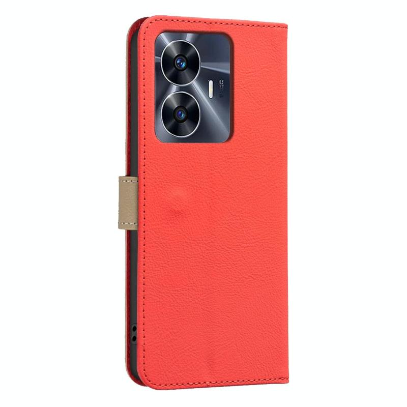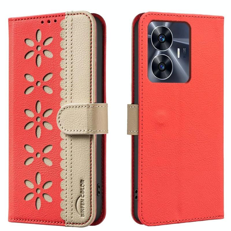 For Realme C55 Splicing Color Hollow Flower Pattern RFID Leather Phone Case(Red)