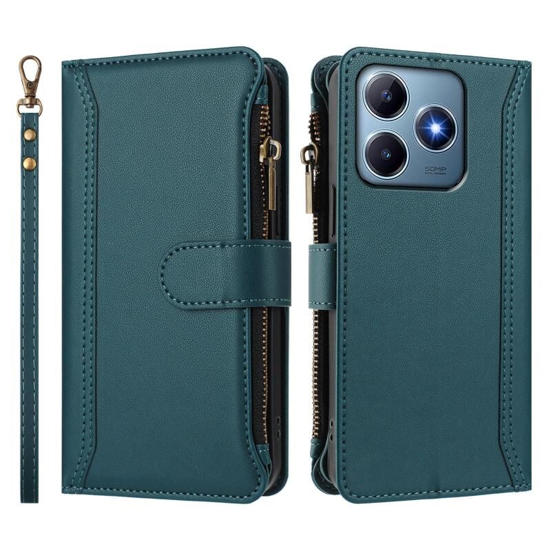 For Realme C63 4G Global / Narzo N63 4G Magnetic Closure 9 Card Slots Zipper Leather Case with Hand Strap(Dark Green)