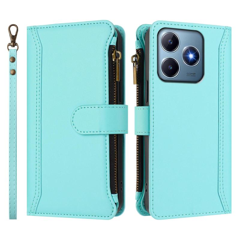 For Realme C63 4G Global / Narzo N63 4G Magnetic Closure 9 Card Slots Zipper Leather Case with Hand Strap(Mint Green)