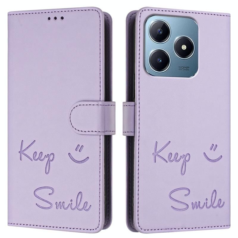 Για Realme C63 / C61 Παγκόσμια χαμόγελο ανάγλυφο RFID δερμάτινη θήκη τηλεφώνου (Light Purple)