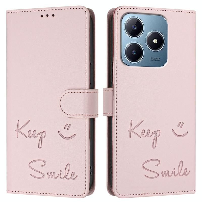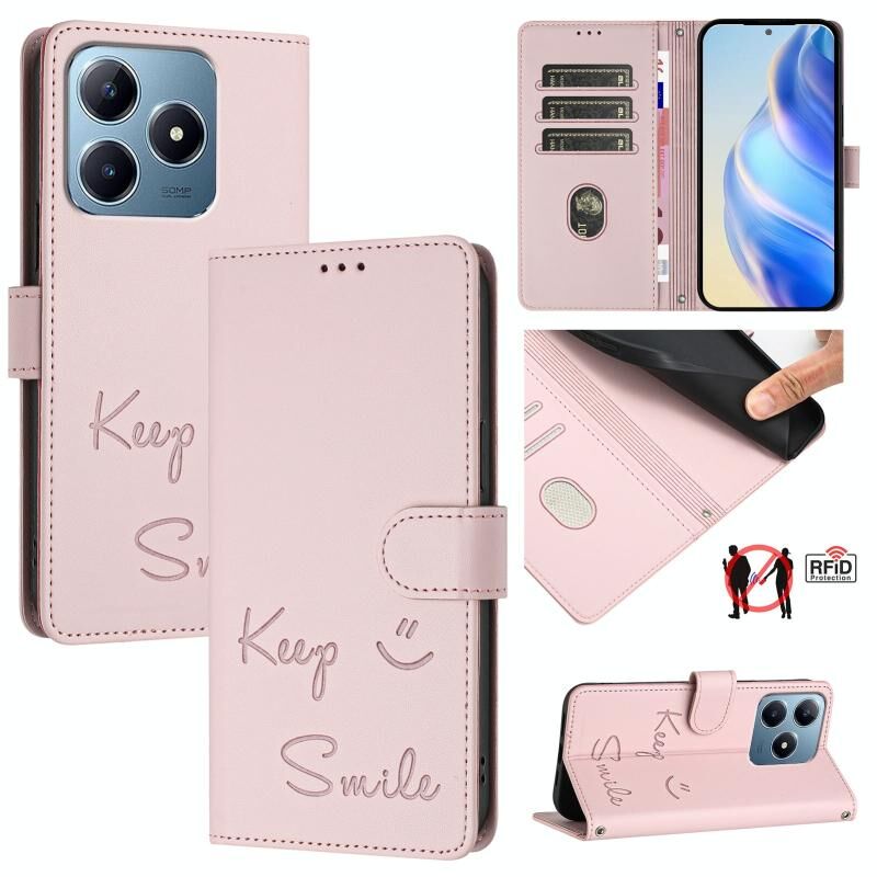 Για Realme C63 / C61 Παγκόσμια χαμόγελο ανάγλυφο RFID δερμάτινη θήκη τηλεφώνου (ροζ)