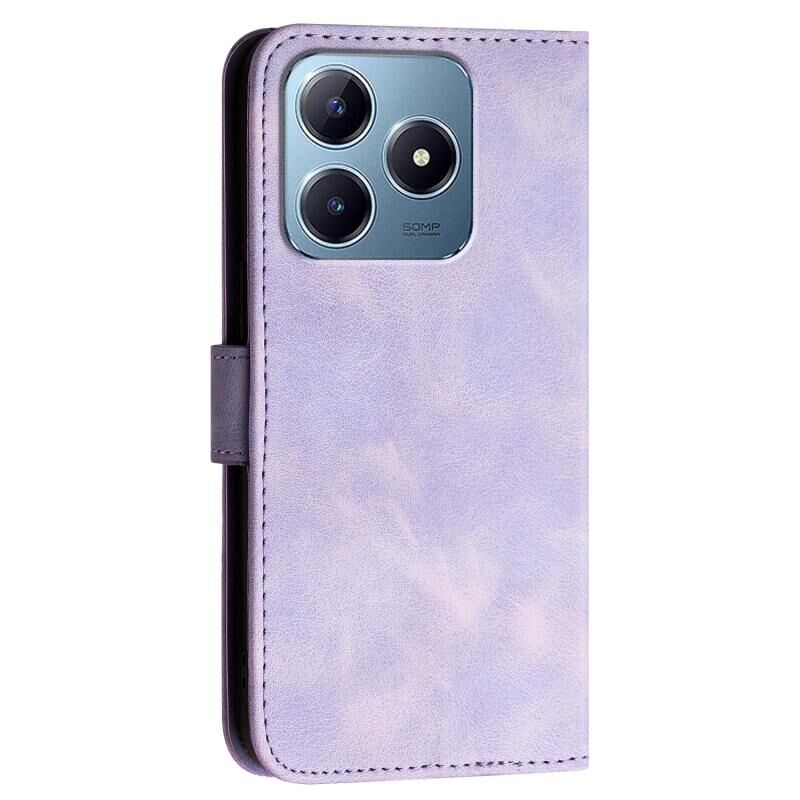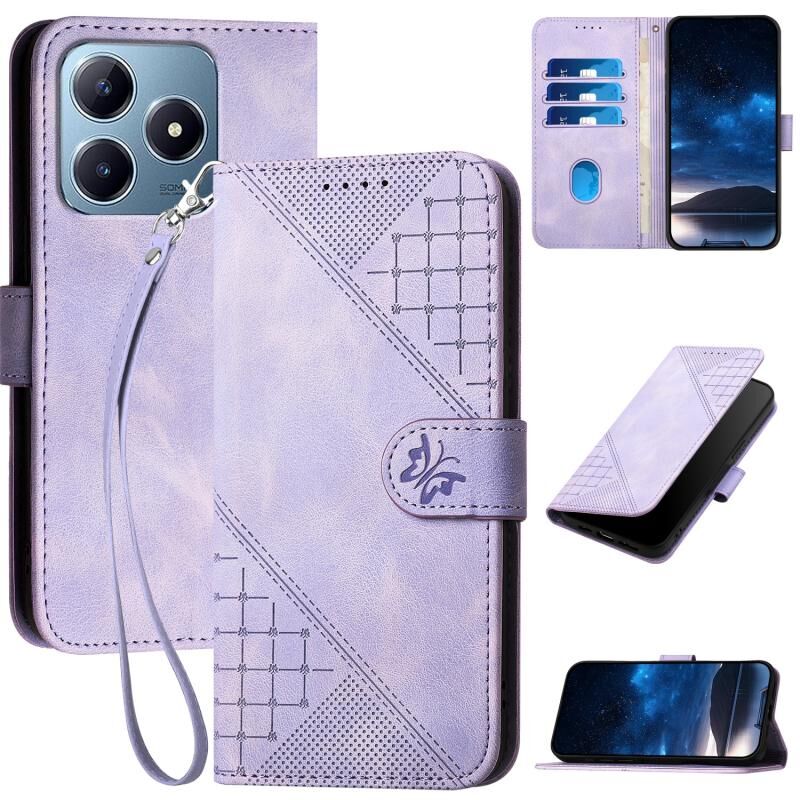 For Realme C63 Global Grid Butterfly Embossed Pattern Leather Phone Case with Lanyard(Light Purple)