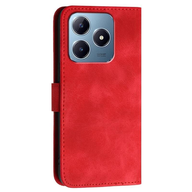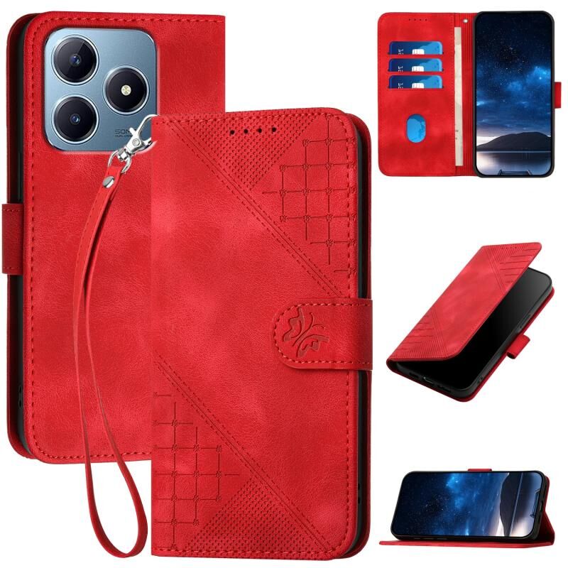 For Realme C63 Global Grid Butterfly Embossed Pattern Leather Phone Case with Lanyard(Red)