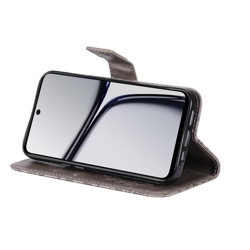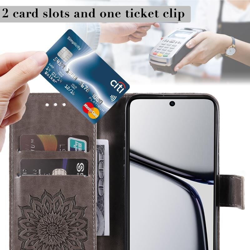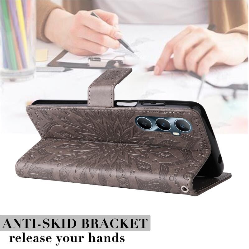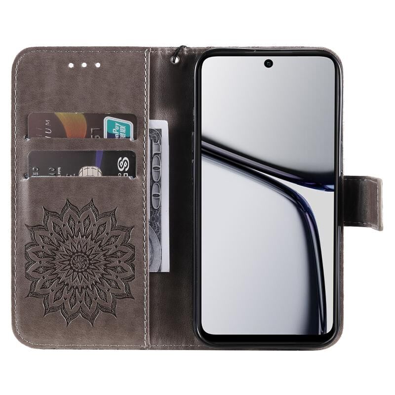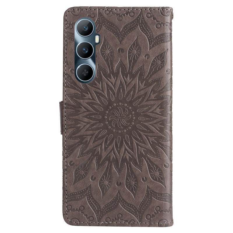 Για Realme C65 4G ανάγλυφο ηλιοτρόπιο μοτίβο Flip υπόθεση τηλεφώνου δέρμα (γκρι)