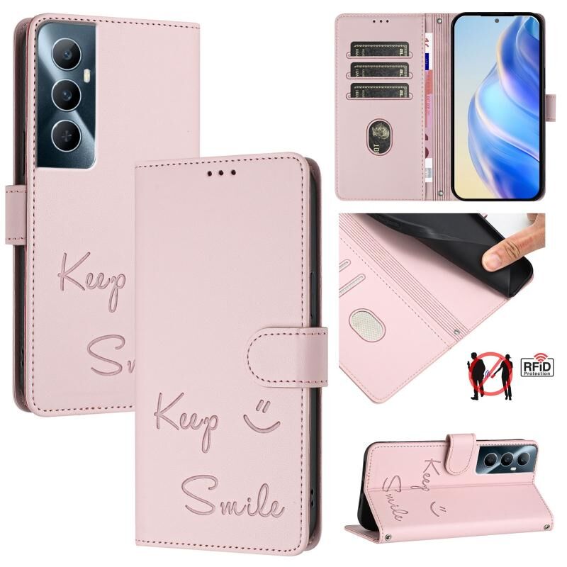 Για Realme C65 4G Παγκόσμια χαμόγελο ανάγλυφο RFID δερμάτινη θήκη τηλεφώνου (ροζ)