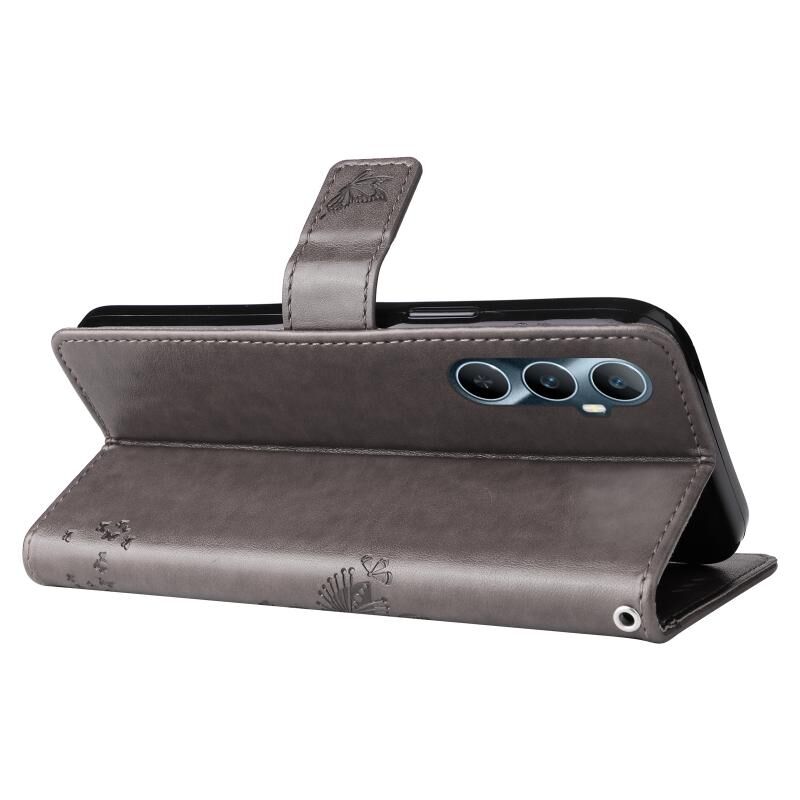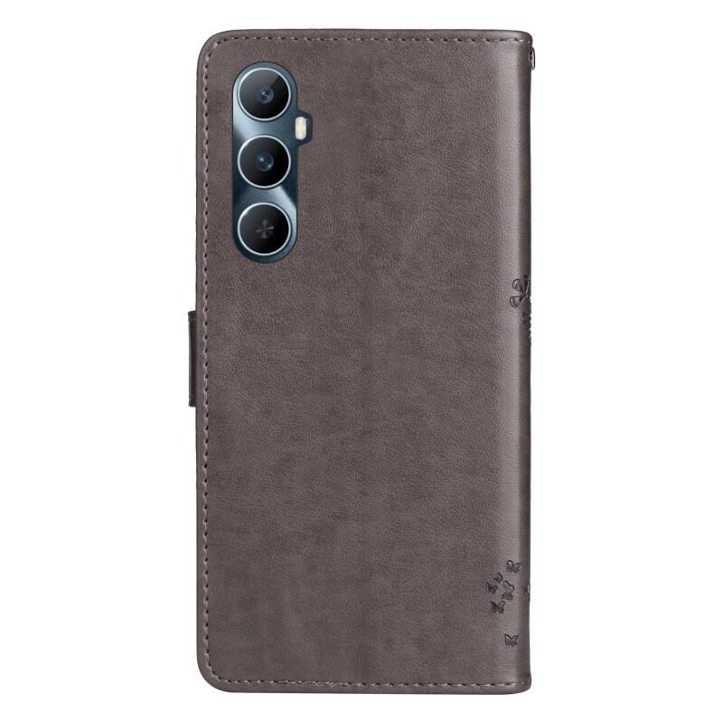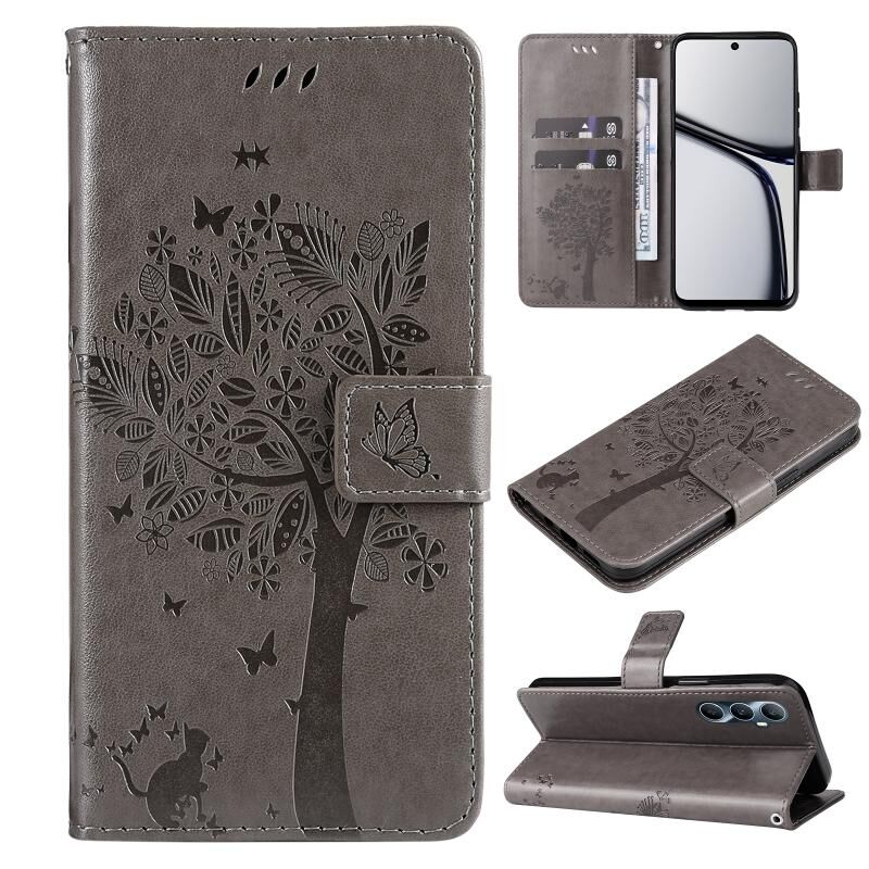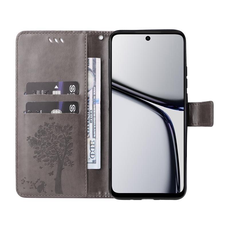 Για Realme C65 4G Tree & Cat ανάγλυφο μοτίβο Flip υπόθεση τηλεφώνου δέρμα (γκρι)
