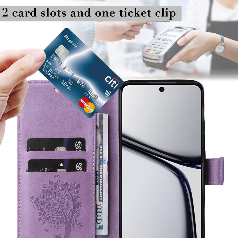 Για Realme C65 4G Tree & Cat ανάγλυφο μοτίβο Flip υπόθεση τηλεφώνου δέρμα (ανοιχτό μοβ)
