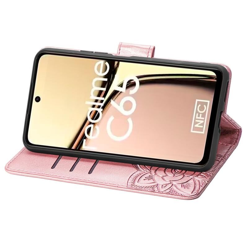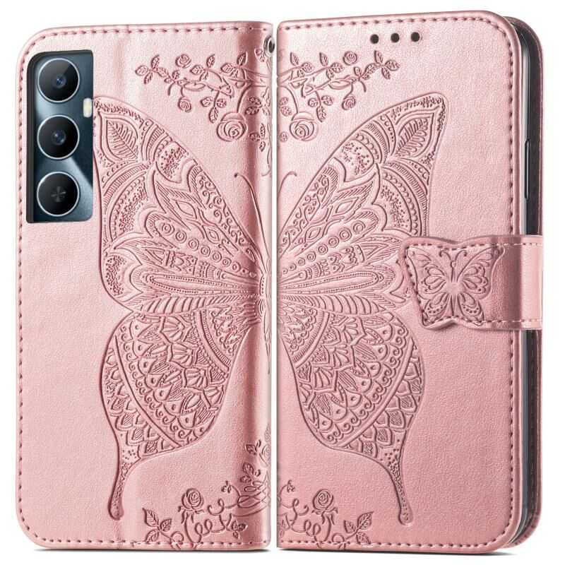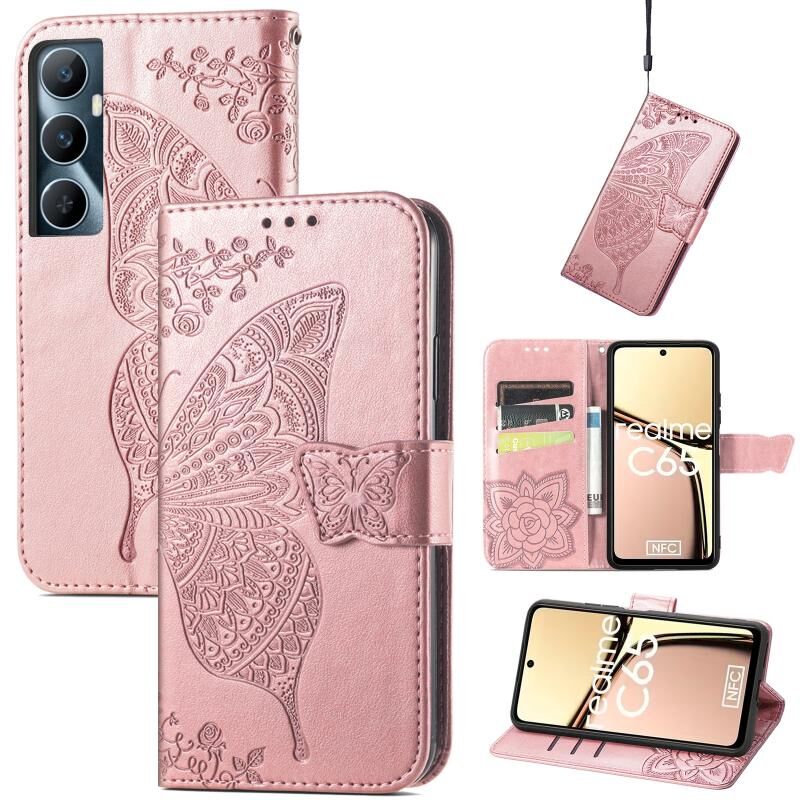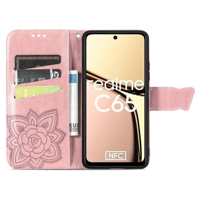 Θήκη τηλεφώνου δερμάτινη ανάγλυφη με σχέδιο πεταλούδας και λουλουδιών για Realme C65 (Χρυσό Ροζ)