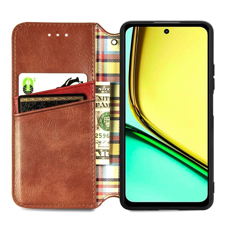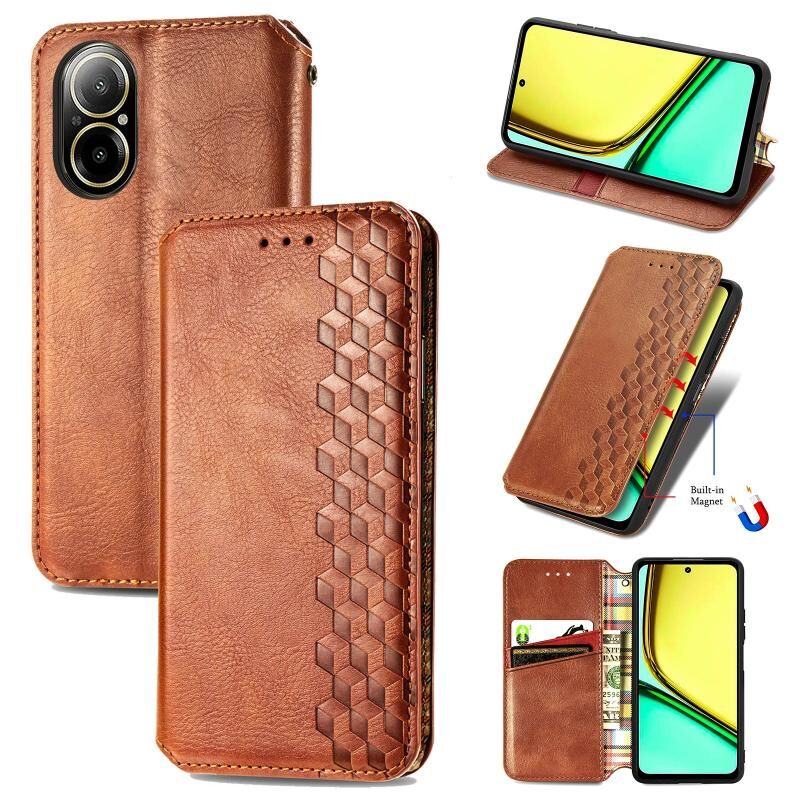 Θήκη τηλεφώνου από δέρμα με μαγνητική απορρόφηση και κυβικό πλέγμα για Realme C67 4G (Καφέ)
