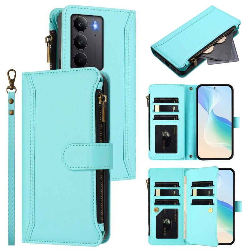 For Realme C75 4G Global / 14x 5G Global Magnetic Closure 9 Card Slots Zipper Leather Case with Hand Strap(Mint Green)