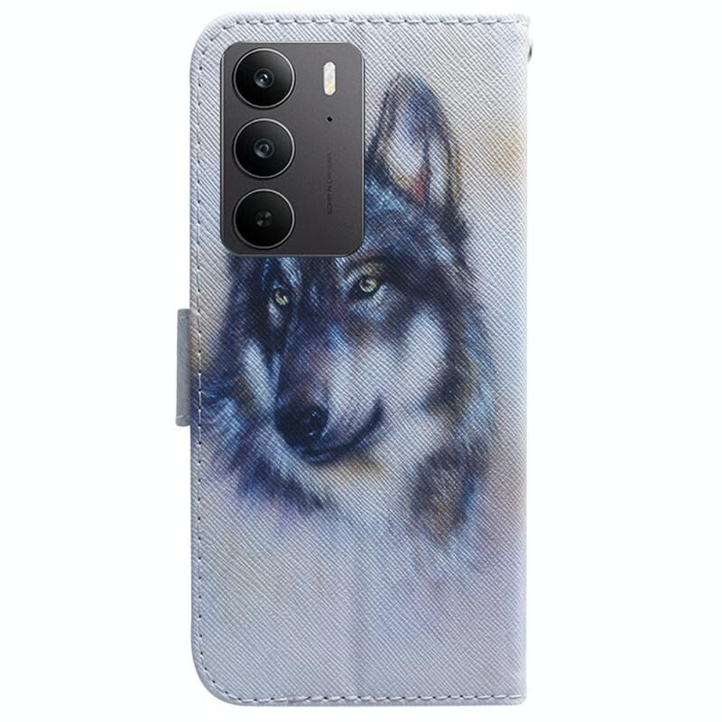 Θήκη τηλεφώνου Realme C75 με σχέδιο και δέρμα που γυρίζει (Λευκός Λύκος)