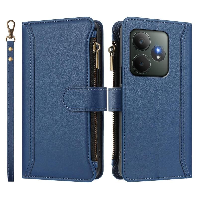 For Realme GT 6 5G Global / GT 6T 5G Global Magnetic Closure 9 Card Slots Zipper Leather Case with Hand Strap(Dark Blue)