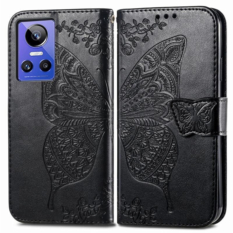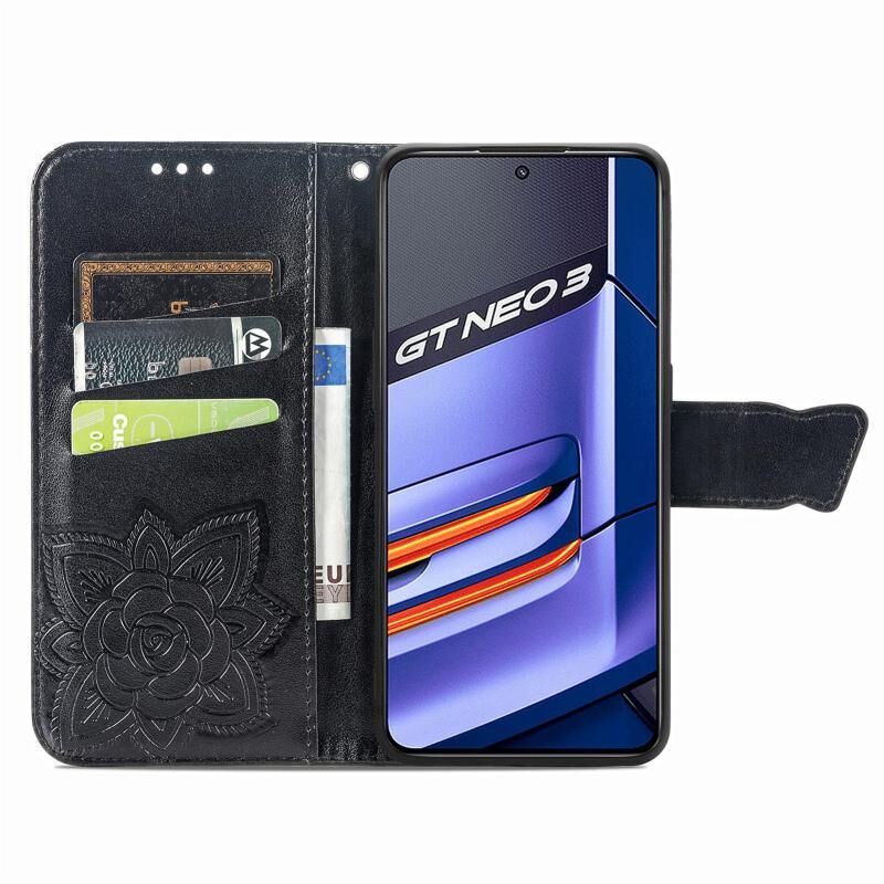 Θήκη τηλεφώνου από δέρμα με ανάγλυφο σχέδιο πεταλούδας και λουλουδιών για Realme GT Neo 3 (Μαύρο)
