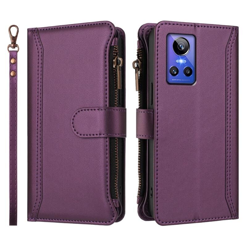 For Realme GT Neo3 Magnetic Closure 9 Card Slots Zipper Leather Case with Hand Strap(Purple)