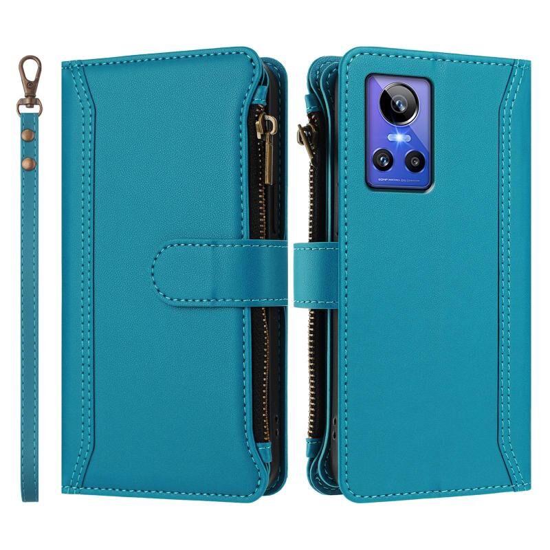 For Realme GT Neo3 Magnetic Closure 9 Card Slots Zipper Leather Case with Hand Strap(Turquoise)