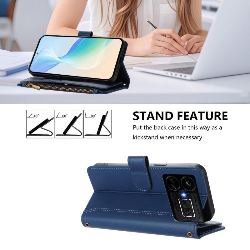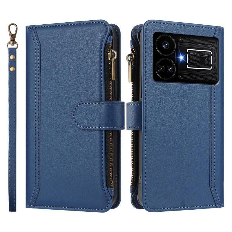 For Realme GT5 240W / GT5 5G Magnetic Closure 9 Card Slots Zipper Leather Case with Hand Strap(Dark Blue)