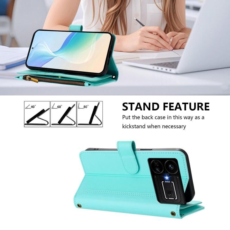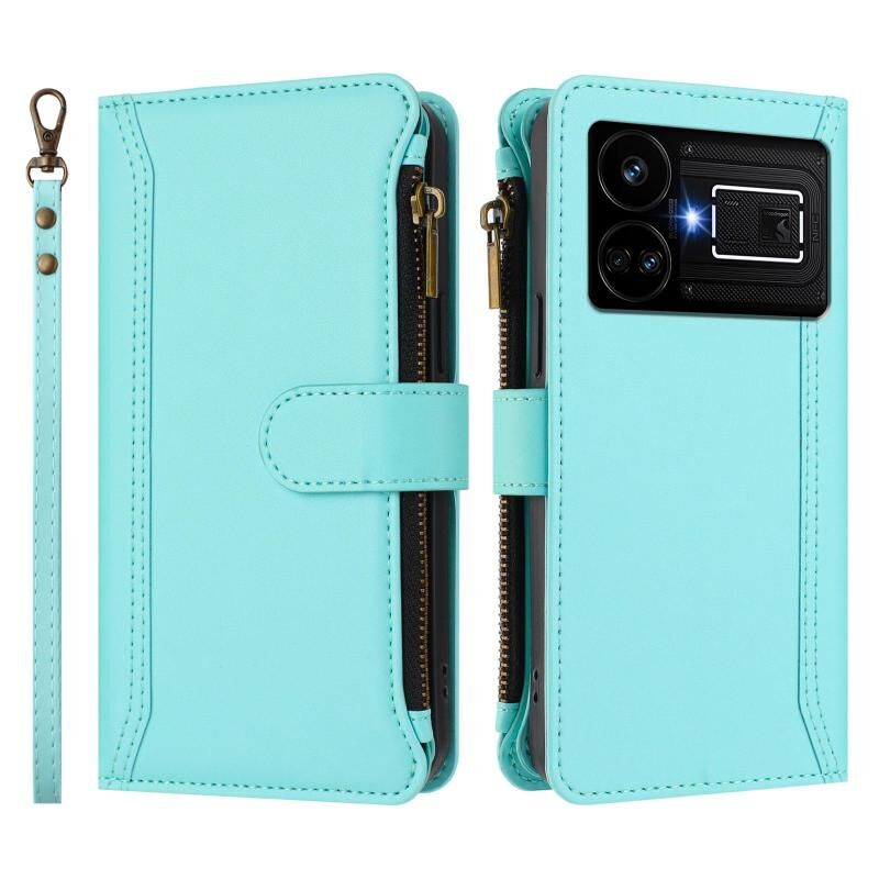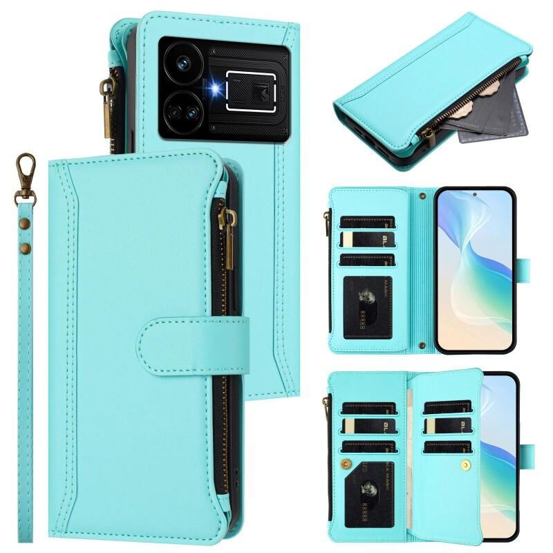 For Realme GT5 240W / GT5 5G Magnetic Closure 9 Card Slots Zipper Leather Case with Hand Strap(Mint Green)