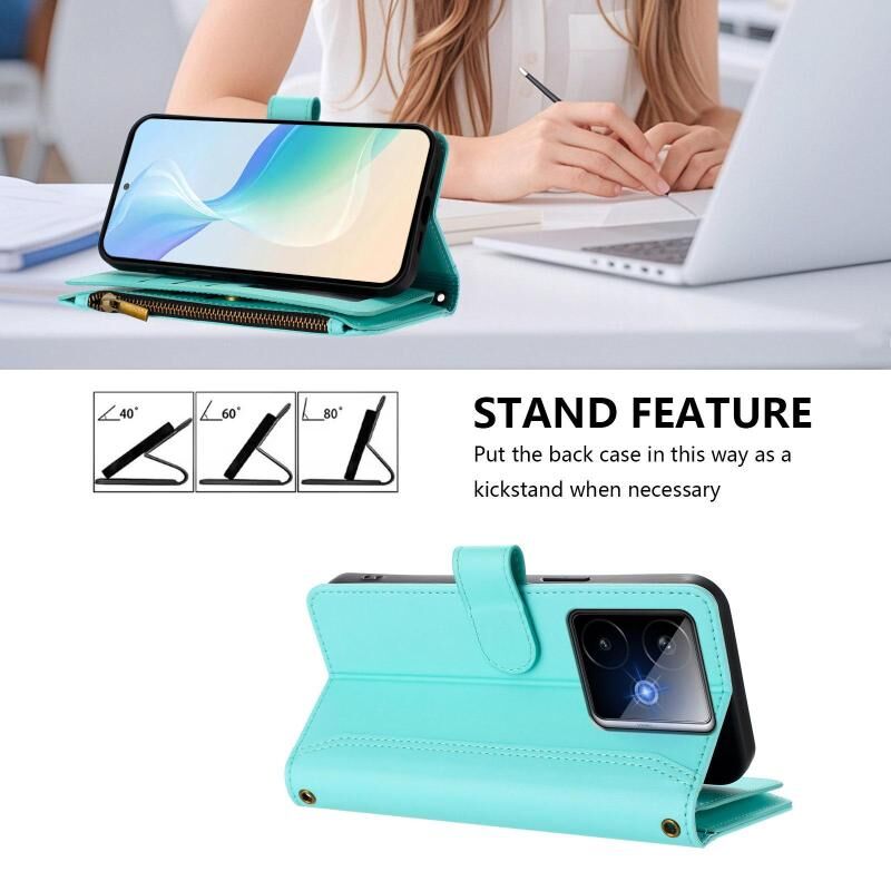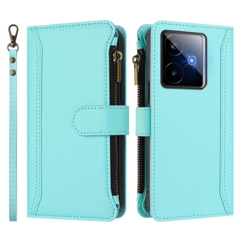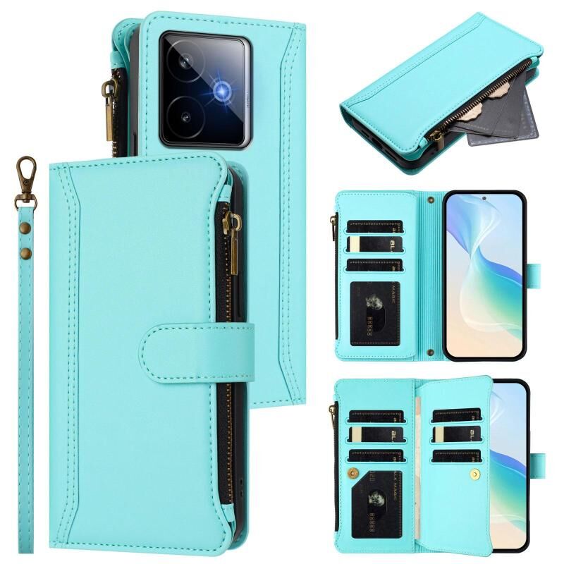 For Realme GT7 Magnetic Closure 9 Card Slots Zipper Leather Case with Hand Strap(Mint Green)