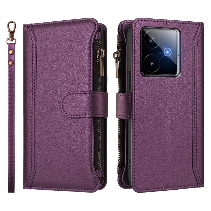 For Realme GT7 Magnetic Closure 9 Card Slots Zipper Leather Case with Hand Strap(Purple)