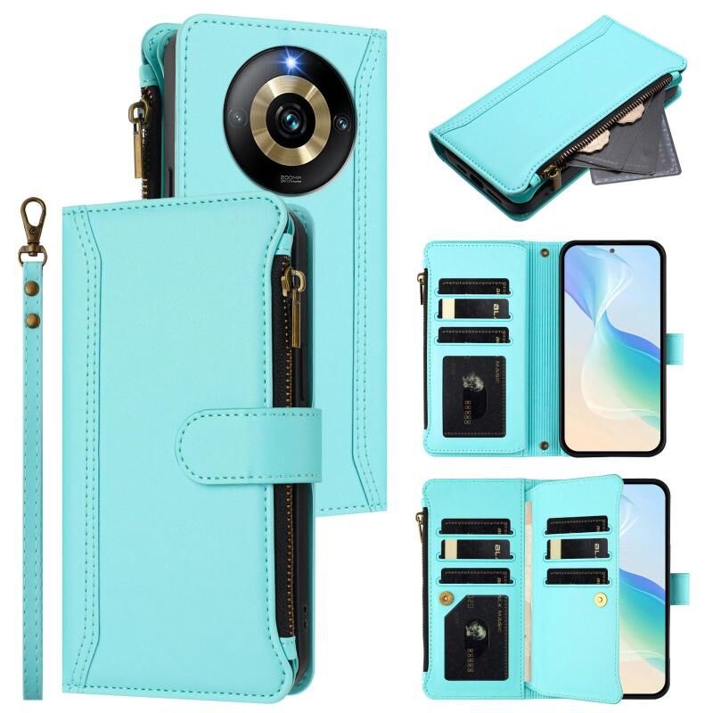 For Realme Narzo 60 Pro Global Magnetic Closure 9 Card Slots Zipper Leather Case with Hand Strap(Mint Green)