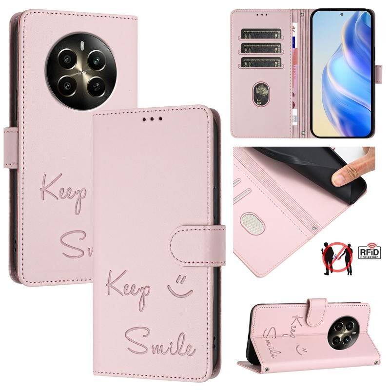 Για Realme Narzo 70 Pro 5G Ινδία χαμόγελο ανάγλυφο RFID δερμάτινη θήκη τηλεφώνου (ροζ)