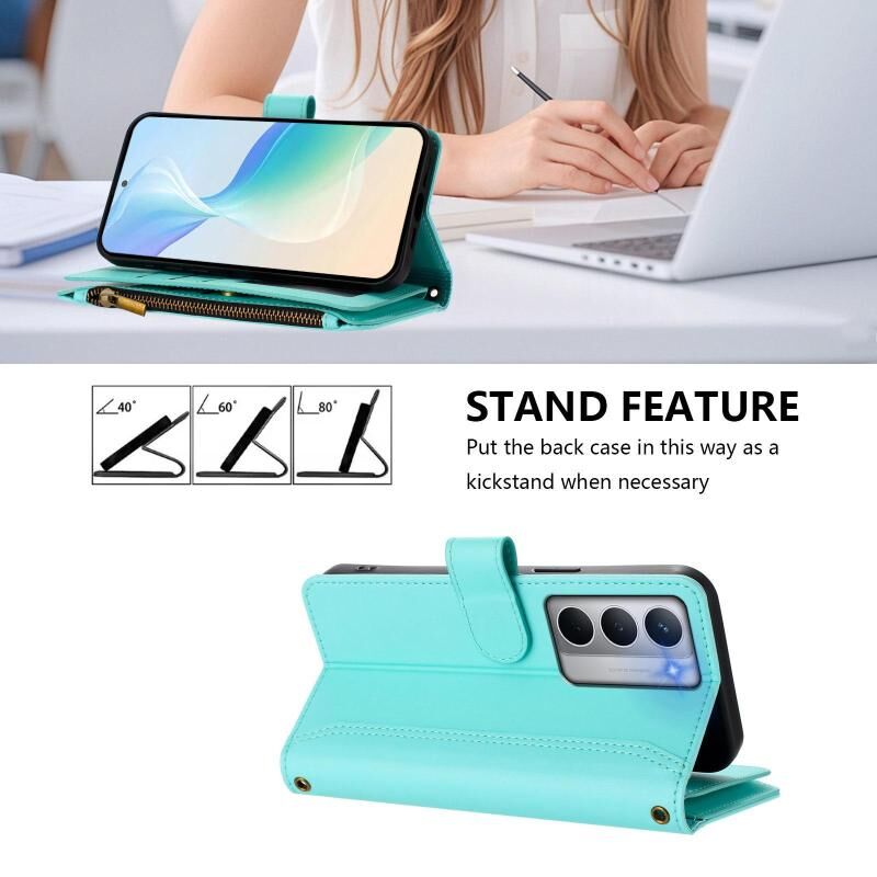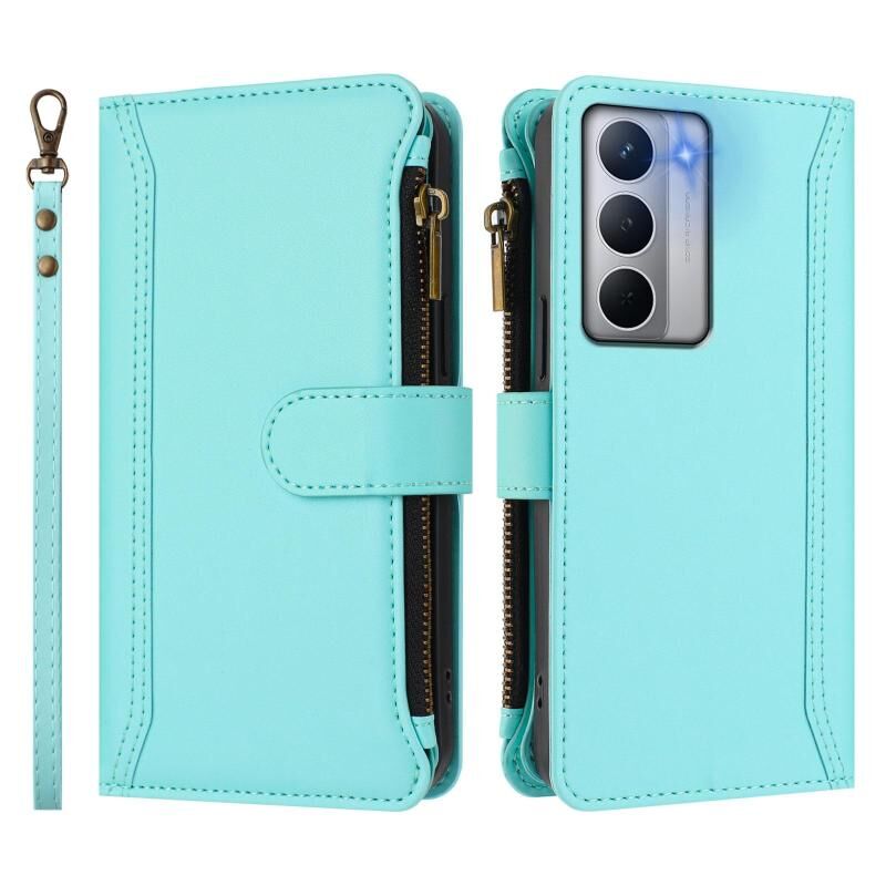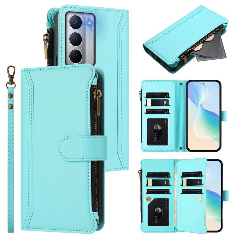For Realme Narzo 80X Magnetic Closure 9 Card Slots Zipper Leather Case with Hand Strap(Mint Green)