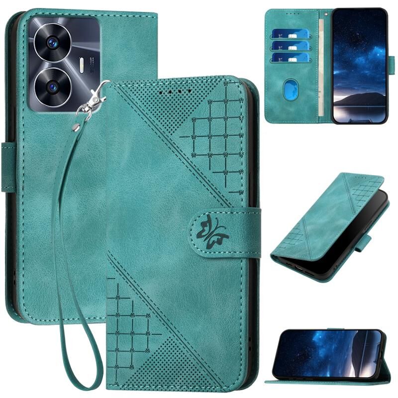 For Realme Narzo N55 Grid Butterfly Embossed Pattern Leather Phone Case with Lanyard(Light Blue)