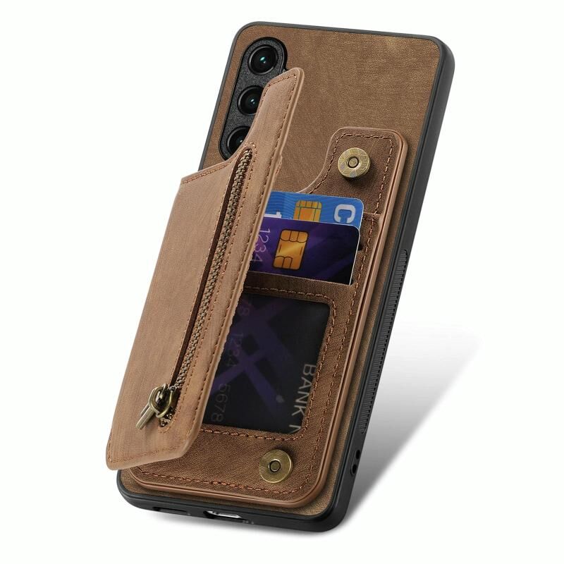 2. Λειτουργία πορτοφολιού: Η δερμάτινη θήκη είναι εξοπλισμένη με υποδοχές για κάρτες και ένα μικρό ποσό μετρητών.