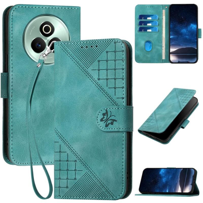 For Realme P3 Pro Grid Butterfly Embossed Pattern Leather Phone Case with Lanyard(Light Blue)